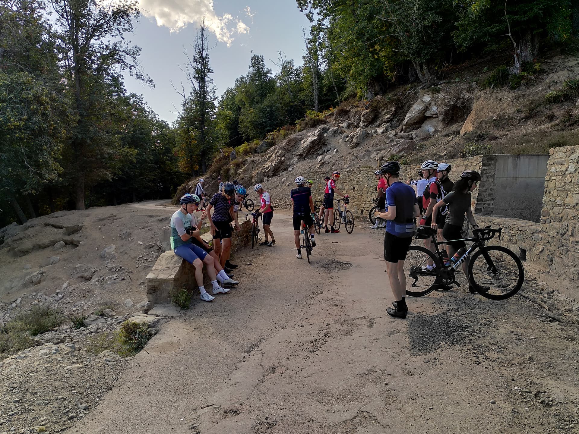 Am bisher höchsten Pass mit 1300 Metern kam von der anderen Auffahrt eine Radgruppe aus Estland mit teuerstmöglichem Material hochgefahren. Der Erste hatte es besonders eilig und fuhr mit belegter Stulle im Mund gleich wieder bergab.