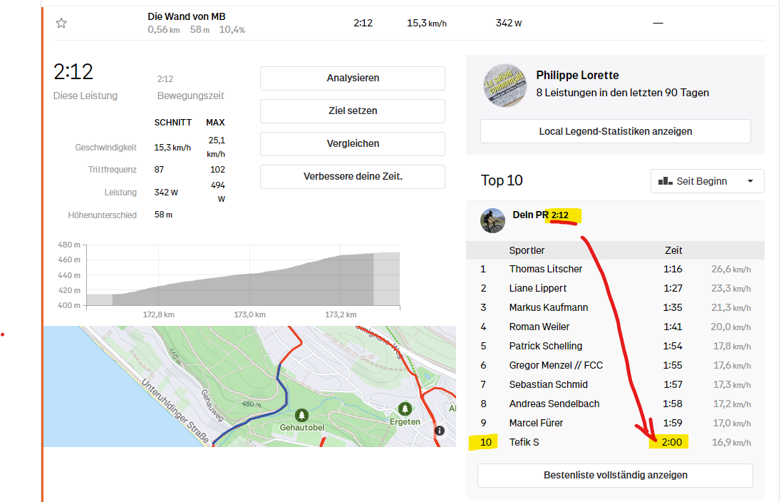 Ein nur etwas anderes Segment des gleichen Anstiegs. Eigentlich fehlen da so einige schnellere Fahrer:innen des obigen Segments. Egal, nehm ich mit, Strava-Magic. ![]()