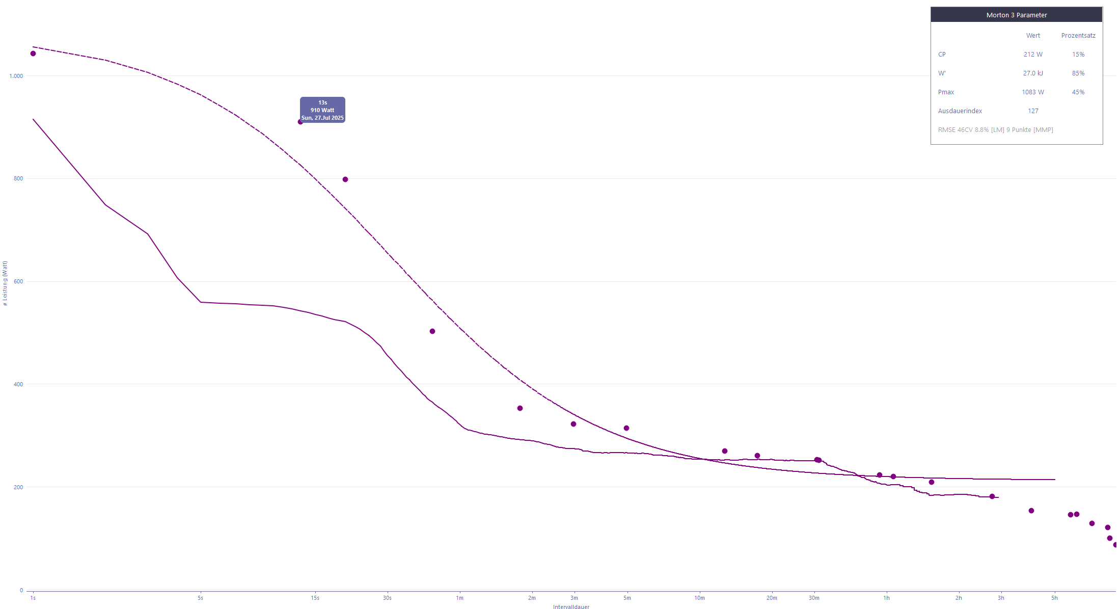 Die gestrichelte Linie ist quasi die ideale Leistungkurve, da die einzelnen Punkte dazu die Bestwerte in Bezug zu bestimmten Intervallen abbilden und diese aus ganz unterschiedlichen Datensätzen/Einheiten stammen.